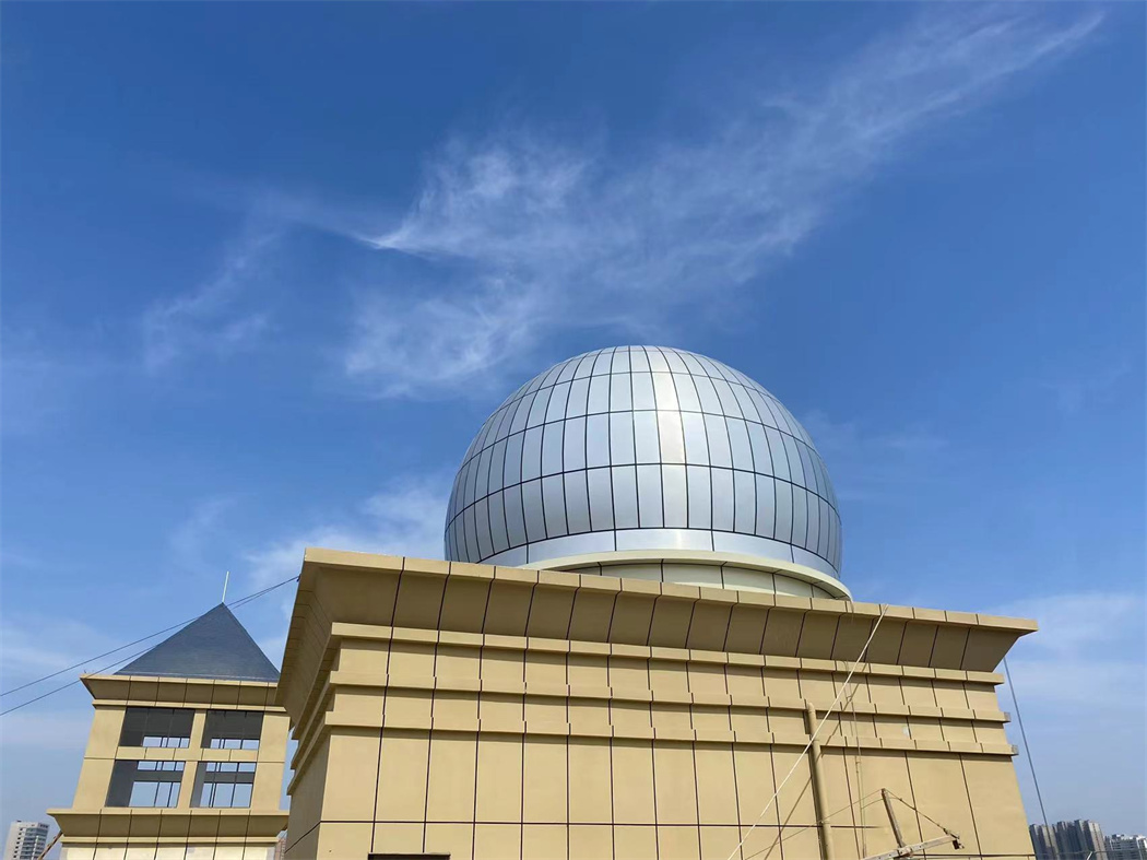 淮北中學(xué)天文臺,在樓頂搭建一座2.5米高房子,雙層結(jié)構(gòu),外板采用鋁塑板,內(nèi)板采用微孔鋁板,中間有吸音棉,一樓鋪設(shè)地磚,二樓鋼結(jié)構(gòu),鋼平臺大梁小梁采用矩形管,定制望遠(yuǎn)鏡基座,用于后期放置望遠(yuǎn)鏡用,制作順墻弧形鋼梯,扶手采用市場專用扶手,美觀、牢固。上層配備9米經(jīng)典式天文圓頂,外殼光滑,具備抗腐蝕,防銹,密封防塵好,不漏雨,也是天文觀測的標(biāo)志性建筑,經(jīng)典型天文圓頂古典美麗,是大眾認(rèn)知度很高的一種天文建筑。